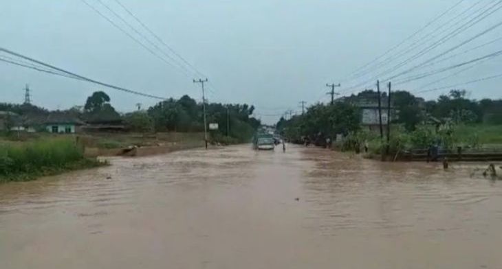 IMCNews.ID, Muaro Jambi - Ruas jalan Jambi-Palembang tepatnya di Desa Pondok Meja, Km 13, Kecamatan Mestong, Kabupaten Muaro Jambi direndam banjir akibat guyuran hujan deras, Senin (10/1/2022) siang.