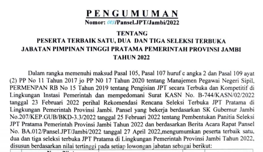 Hal ini diketahui dari pengumuman Pansel dengan nomor 013/Pansel.JPT/Jambi/2022 tentang hasil pengumuman peserta terbaik satu, dua dan tiga hasil seleksi terbuka Jabatan Tinggi Pratama di lingkungan Pemerintah Provinsi Jambi tahun 2022 tertanggal 12 Mei 2022 yang ditandatagani oleh Ketua Pansel, Prof Sukamto Sutoto.