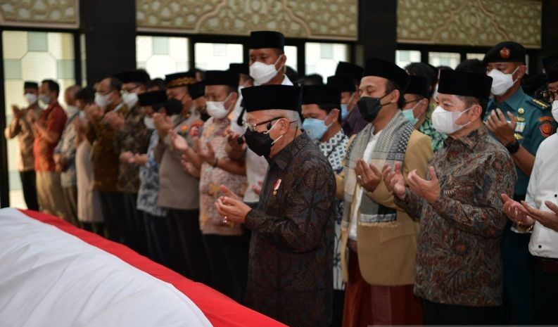 IMCNews.ID, Jakarta - Wakil Presiden Ma'ruf Amin memimpin salat jenazah Menteri Pendayagunaan Aparatur Negara dan Reformasi Birokrasi (Menpan RB) Tjahjo Kumolo di Masjid Quba, Gedung Kemenpan RB, Jakarta, Jumat (01/7).