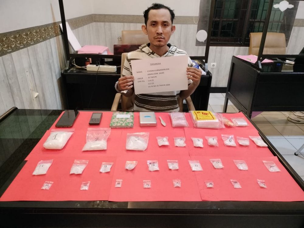 Barang bukti yang diamankan yaitu sabu 28 paket, timbangan digital, dua smartphone, dan lainnya, tersangka bernama Ichsan Kurniawan.