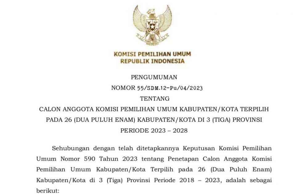 Sesuai pengumuman Nomor 55/SDM.12-Pu/04/2023 tentang calon anggota KPU 26 Kabupaten/Kota di tiga Provinsi. (IMC01)