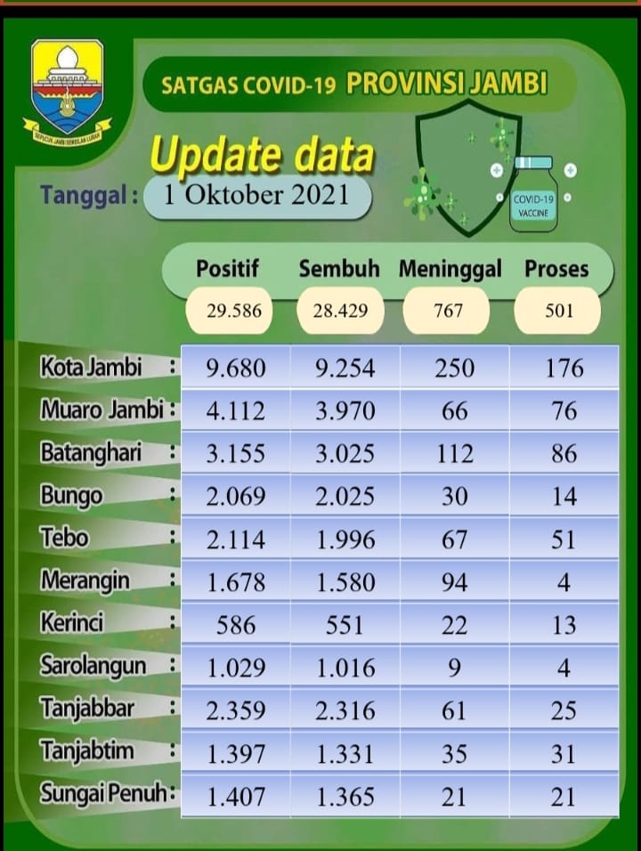 IMCNews.ID, Jambi - Sebanyak 39 orang dinyatakan positif COVID-19, Jumat (1/10/2021) sehingga total kasus terkonfirmasi mencapai sebanyak 29.586 orang.