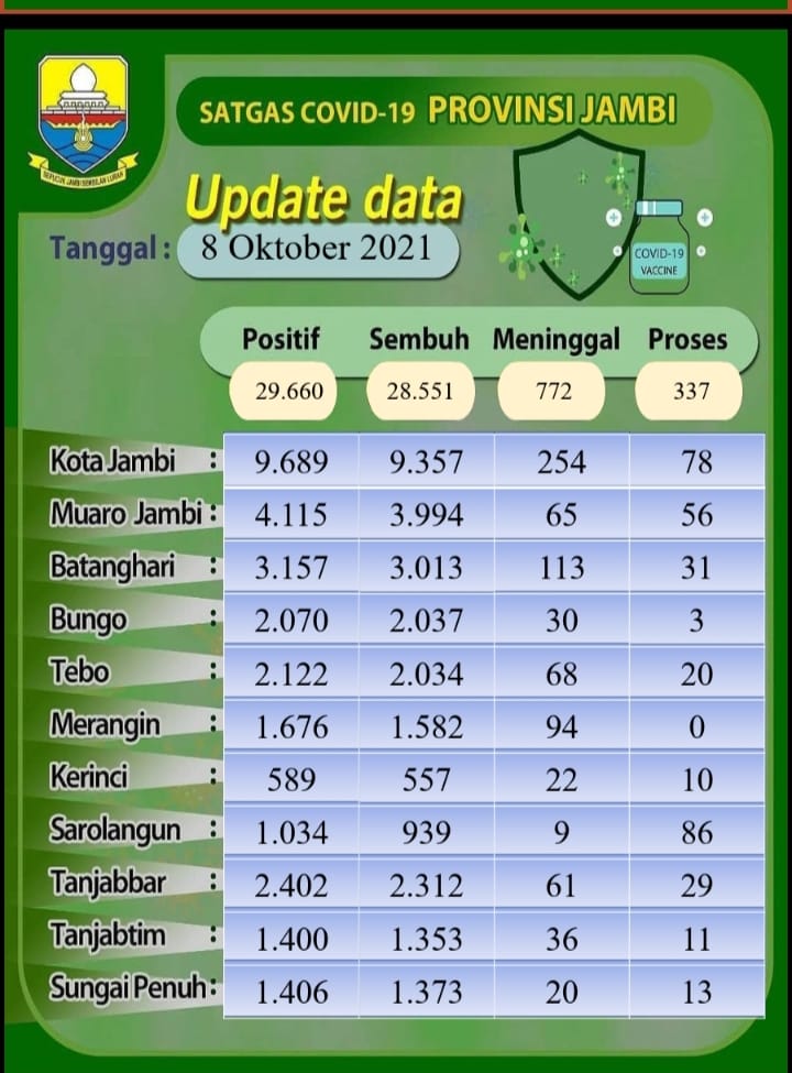 IMCNews.ID, Jambi - Sebanyak 6 orang dinyatakan positif COVID-19, Jum'at (8/10/2021) sehingga total kasus terkonfirmasi mencapai sebanyak 29.660 orang.