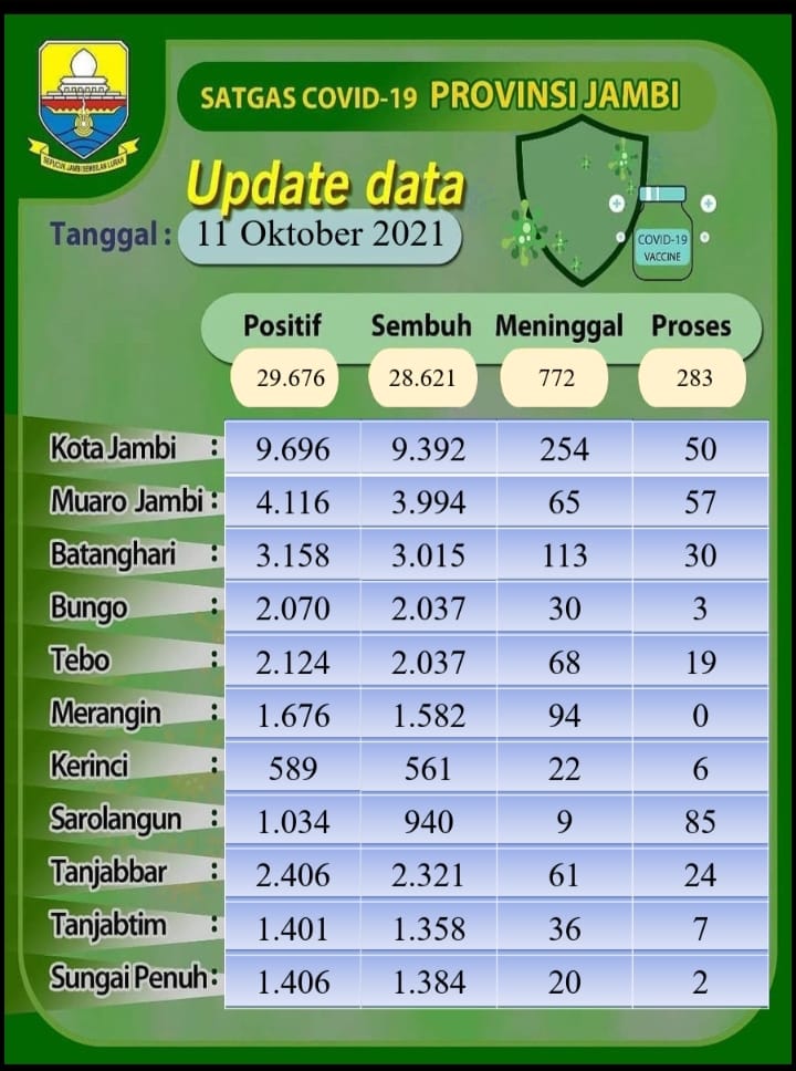 IMCNews.ID, Jambi - Tiga orang dinyatakan positif covid-19 pada Senin (11/10/2021). Masing masing tambahan pasien ini berasal dari Kota Jambi, Batanghari dan Tanjab Barat.
