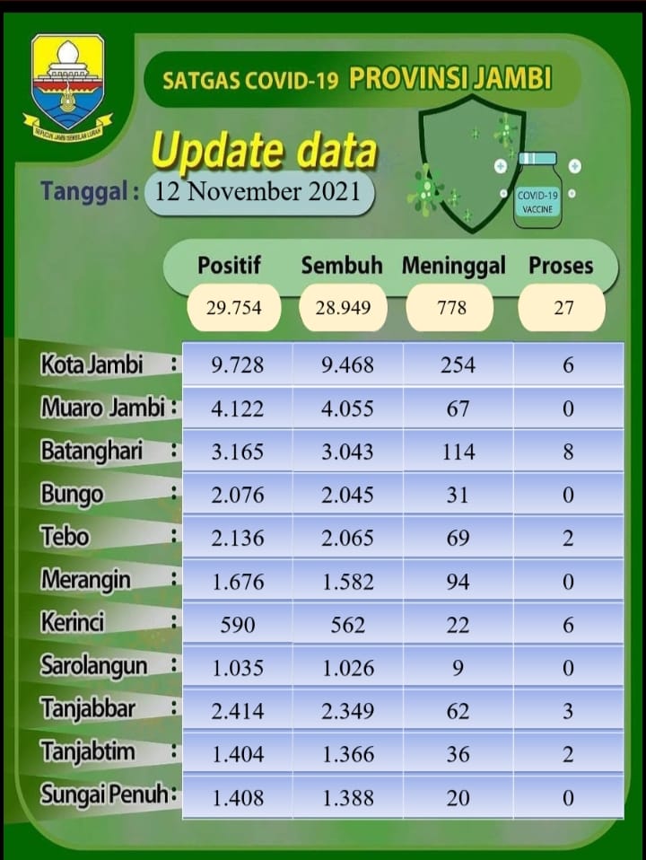 IMCNews.ID, Jambi - Tak ada penambahan pasien positif covid-19 pada Jum'at (12/11/2021).