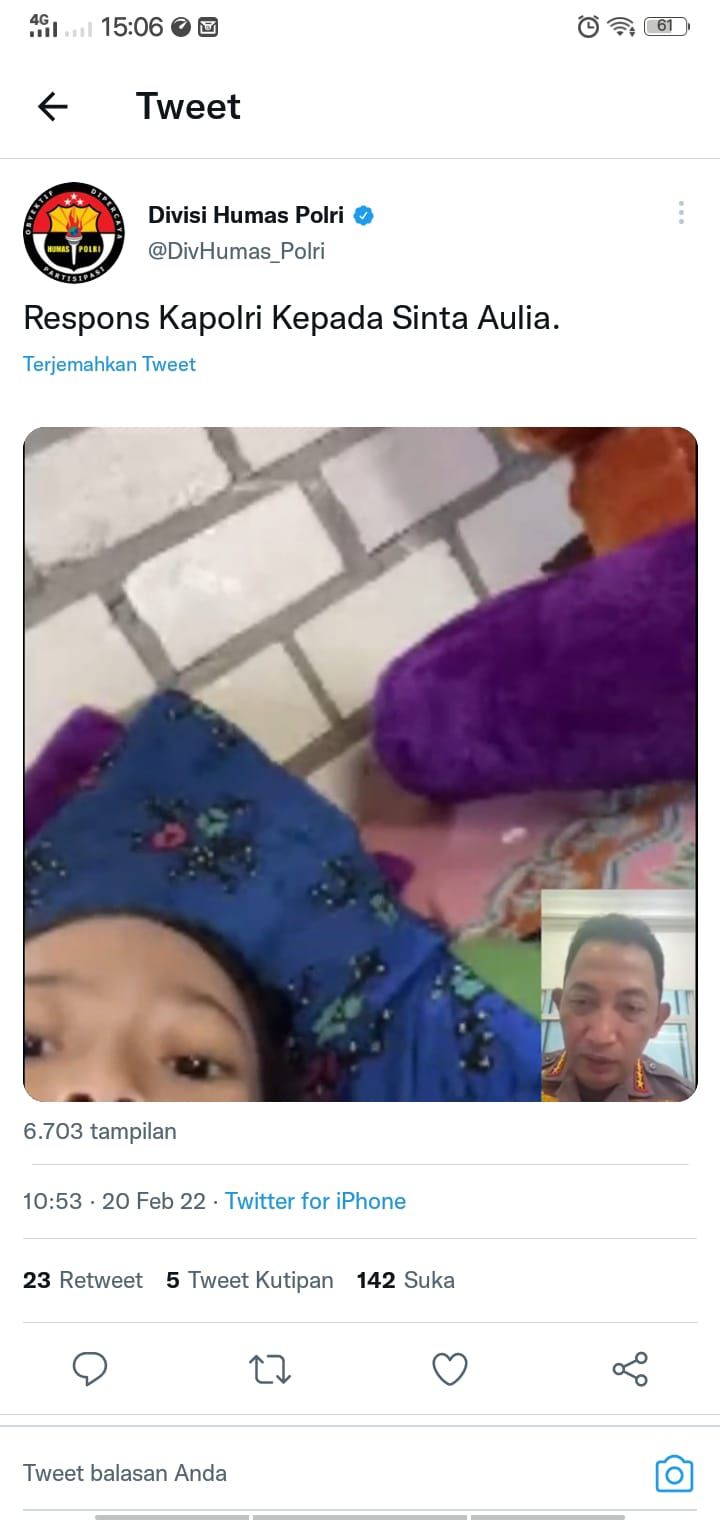 Atensi khusus itu diberikan langsung oleh Kapolri dengan melakukan panggilan video dengan Sinta Aula bersama ibundanya. Video percakapan keduanya tersebut diunggah di media sosial milik Polres Trenggalek, Jawa Timur, di Twitter dan Instagram.