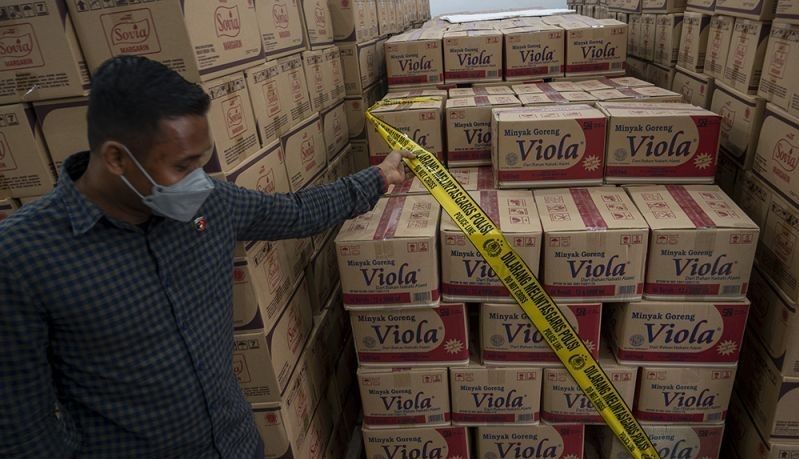 "Kami sudah menyegel dua tempat setelah kami temukan ribuan liter minyak goreng merk Viola, yang sudah ditimbun sejak Oktober 2021. Totalnya ada 4.209 dos atau 53.869 liter, " ujar Ilham. (IMC02/ant)