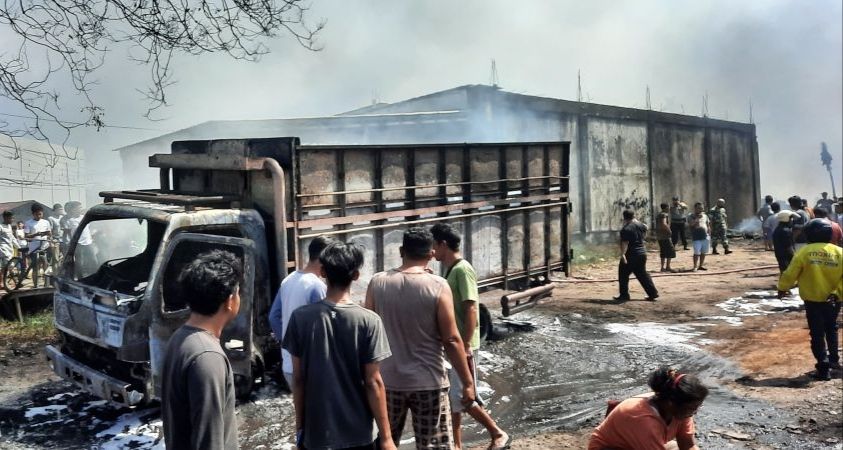 Pantauan di lokasi, tampak satu buah mobil truk terbakar habis di depan pintu gudang. Sementara di dalam gudang, ada beberapa kendaraan dan tangki juga ludes di lalap api.