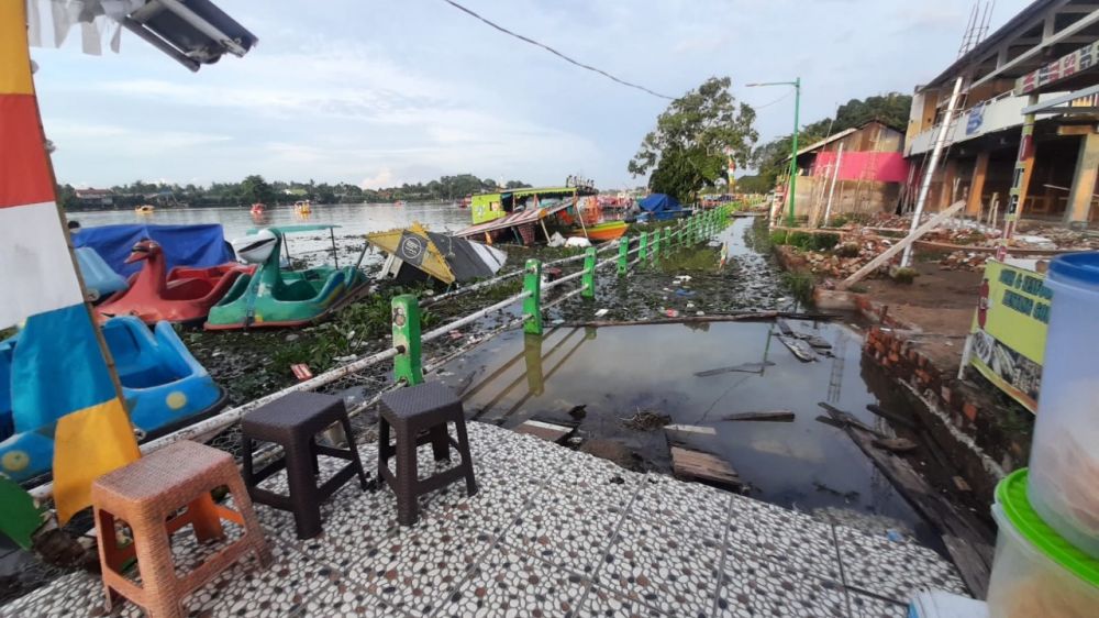 Selain jogging track, terlihat beberapa perahu ketek juga ikut tenggelam. Salah satu warga setempat, Evi mengatakan ambruknya jogging track itu sudah terjadi sejak lama. Namun mulai terendamnya sejak tiga hari terakhir, karena debit air di Danau Sipin naik.