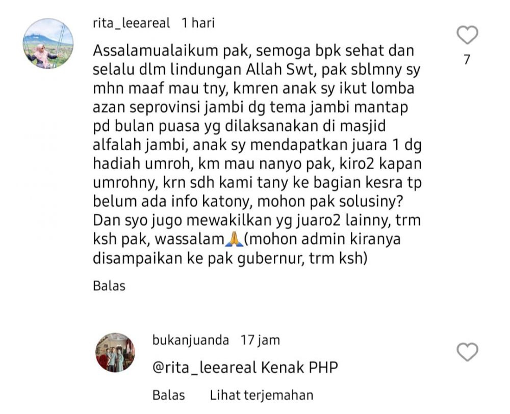 Akun rita_leeareal menyampaikan komentar "Assalamu'alaikum pak, semoga Bpk sehat dan selalu dlm lindungan Allah SWT. Pak sblmnya sy mhn maaf mau tny, kmren anak sy ikut lomba azan se-provinsi Jambi dg tema Jambi mantap pd bulan puasa yg dilaksanakan di mesjid al-falah Jambi, anak sy mendapatkan juara 1 dg hadiah umroh, krn sdh kami tany ke bagian kesra tp belum ada info katony, mohon pak solusiny? Dan syo jugo mewakilkan yang juaro2 lainnya, trm ksh pak, wasal ( mohon admin kiranya disampaikan ke gubernur, trm ksh)"