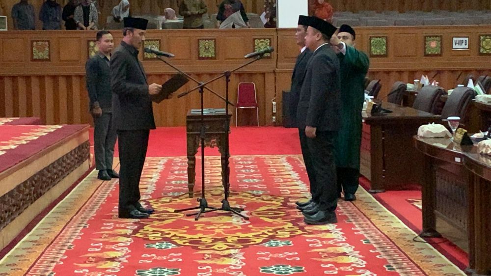 IMCNews.ID, Jambi - DPRD Provinsi Jambi menggelar rapat paripurna DPRD Provinsi Jambi dengan agenda Peresmian Pengangkatan Sumpah/Janji Pengganti Antar Waktu (PAW) Anggota DPRD Provinsi Jambi Sisa Masa Jabatan Tahun 2019 - 2024, atas nama Al Mashuri dan Rukiya Alfa Robi, Minggu (17/12/2023).