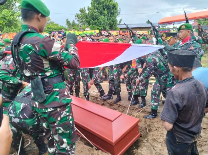 Isak tangis istri dan keluarga dari almarhum Kopda Hendrianto pun pecah mengantarkan almarhum ke peristirahatan terakhirnya. Terlebih saat peti jenazah dimasukkan ke dalam liang lahat.