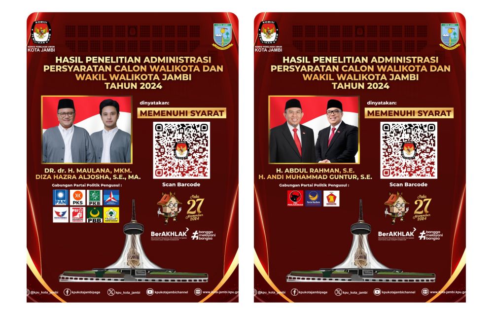 Hasilnya, KPU Kota Jambi menetapkan bahwa dua pasangan yang akan maju bertarung di Pilwako Jambi 2024, yakni Maulana-Diza Hazra Aljosha dan H Abdul Rahman-Andi Muhammad Guntur Memenuhi Syarat (MS) sebagai pasangan calon.