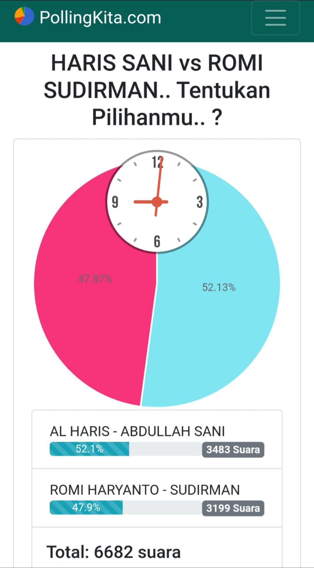 Sampai Senin pagi, 23 September 2024 pukul 08.00 Wib, Haris-Sani sudah diklik sebanyak 52,1% orang (suara). Sementara Romi-Sudirman diklik 47,9% pengikut polling.