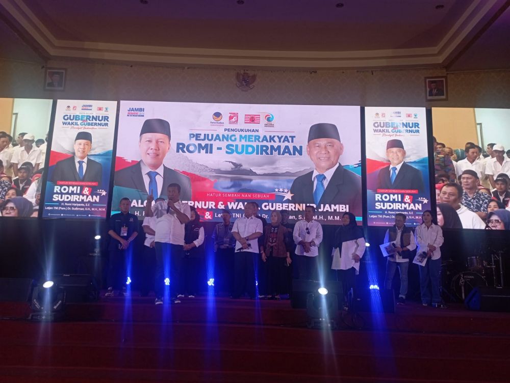 IMCNews.ID, Jambi - Calon Gubernur dan Wakil Gubernur Jambi, Romi Hariyanto-Sudirman melantik tim pemenangan yang diberi nama Pejuang Rakyat, di salah satu hotel di Kota Jambi, Senin (23/9/2024).