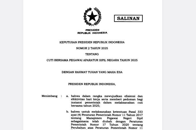 Lembar salinan Keppres Nomor 2 Tahun 2025 menjelaskan bahwa penetapan ini bertujuan untuk meningkatkan efisiensi hari kerja sekaligus memberikan kepastian jadwal cuti bagi instansi pemerintah.